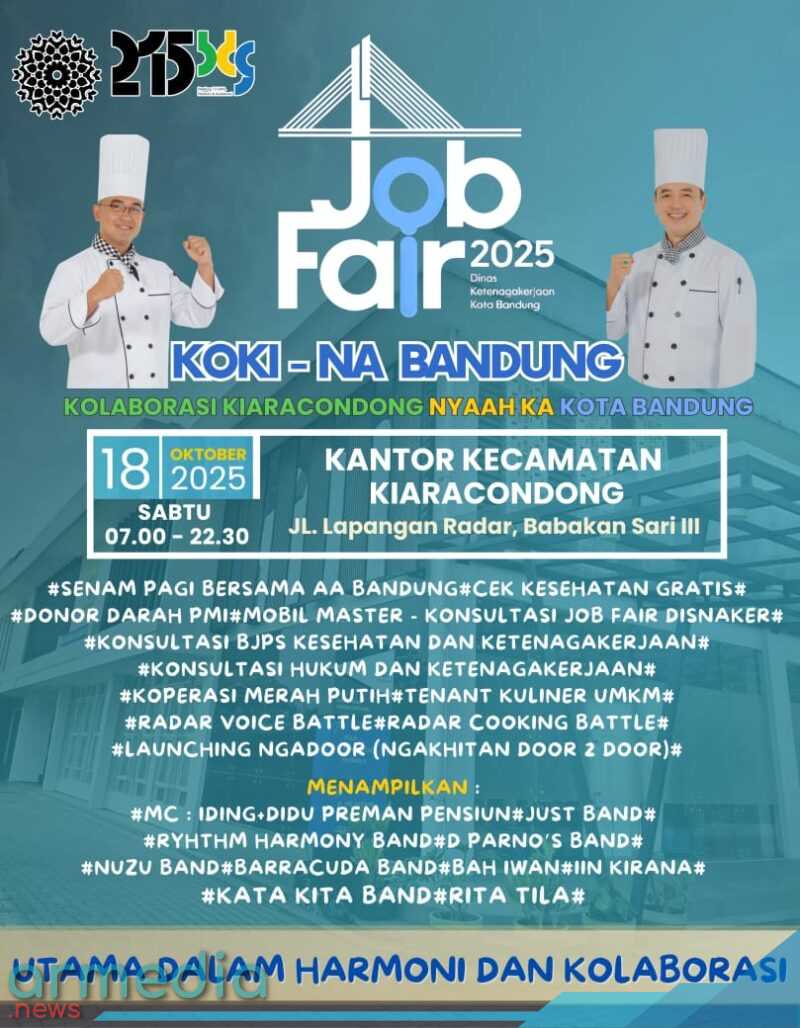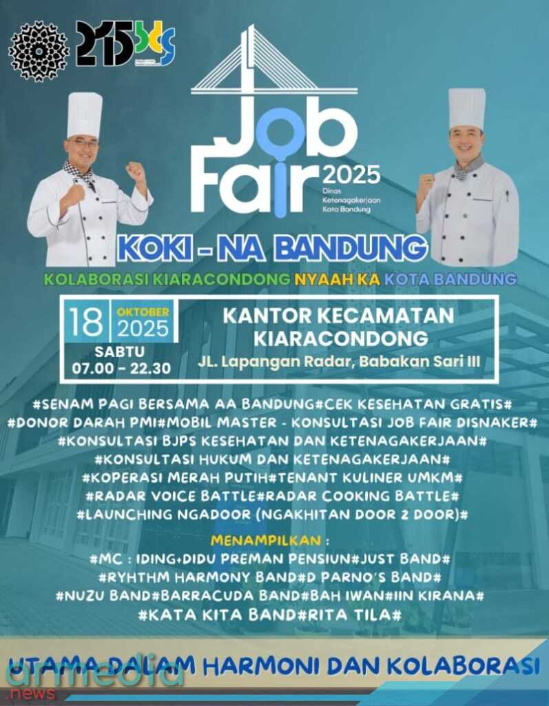 Bandung – Dalam upaya meningkatkan kesempatan kerja dan memperkuat kolaborasi lintas sektor, Dinas Ketenagakerjaan Kota Bandung menggelar Job Fair 2025 bertema “Koki-na Bandung” di halaman Kantor Kecamatan Kiaracondong, Sabtu (18/10/2025). Kegiatan ini berlangsung sejak pagi hingga malam hari, mulai pukul 07.00 hingga 22.30 WIB, dengan menghadirkan beragam program interaktif dan layanan publik.