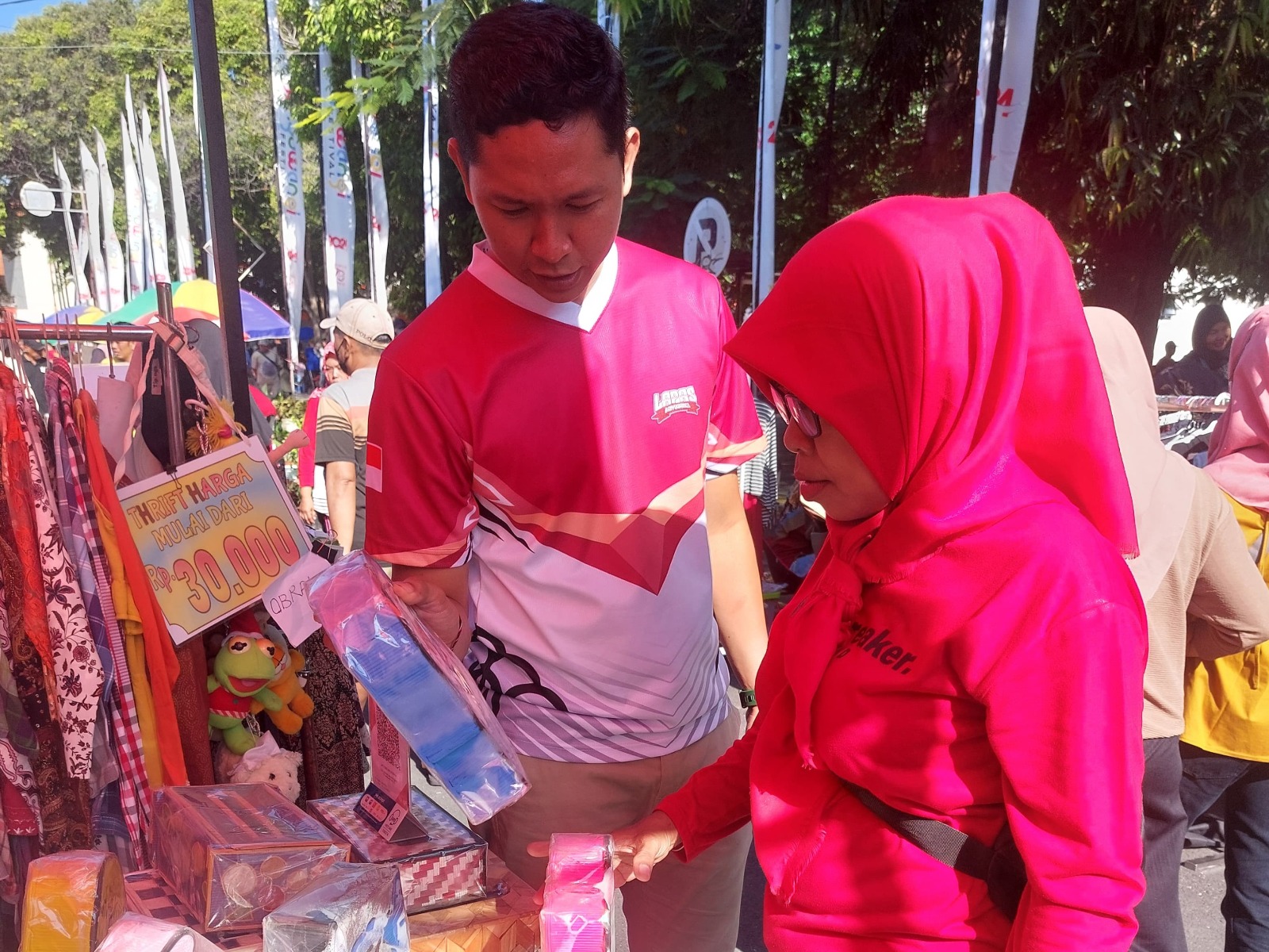 Berbagai produk mulai dari celengan karakter berbahan koran bekas, souvenir, kotak tisu hingga batik mampu menarik perhatian masyarakat yang sedang berolahraga maupun menikmati hari libur bersama keluarga.