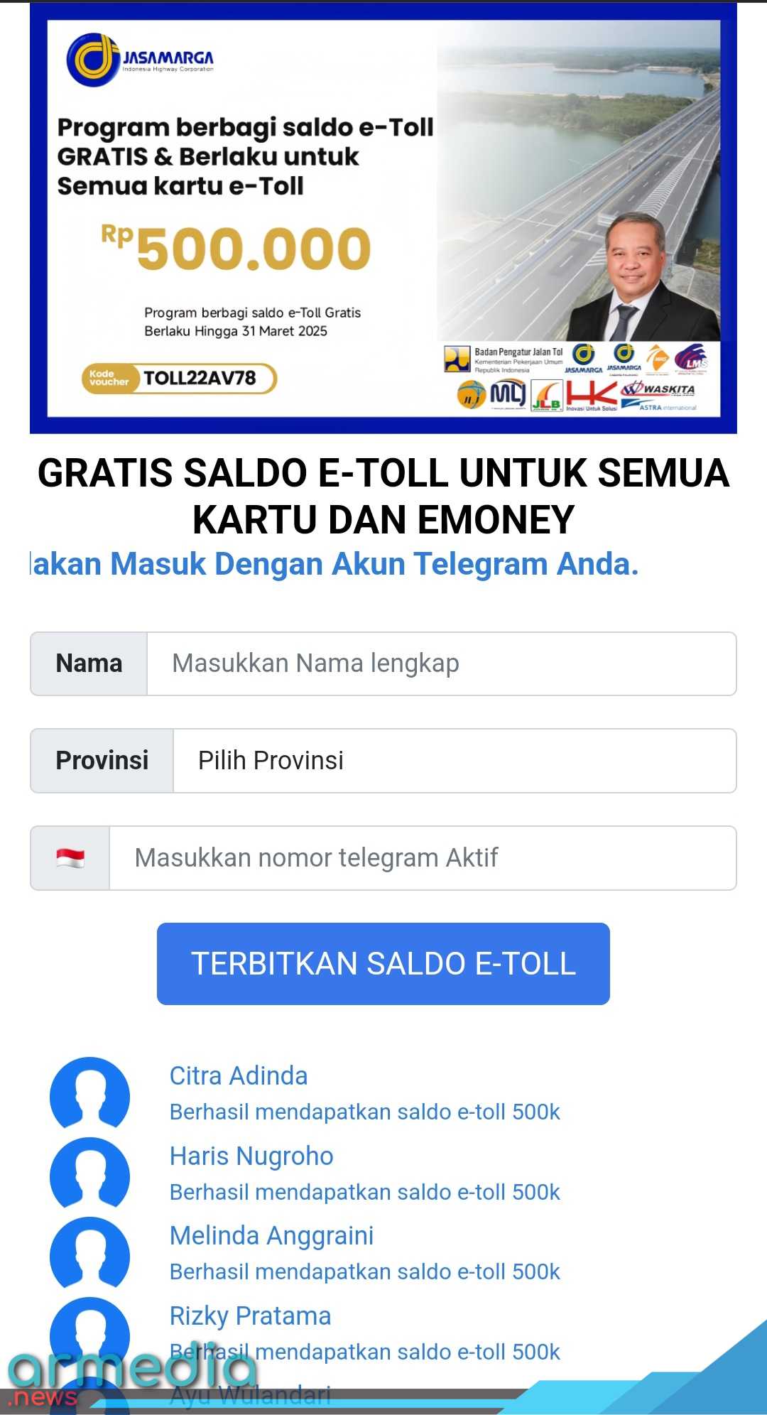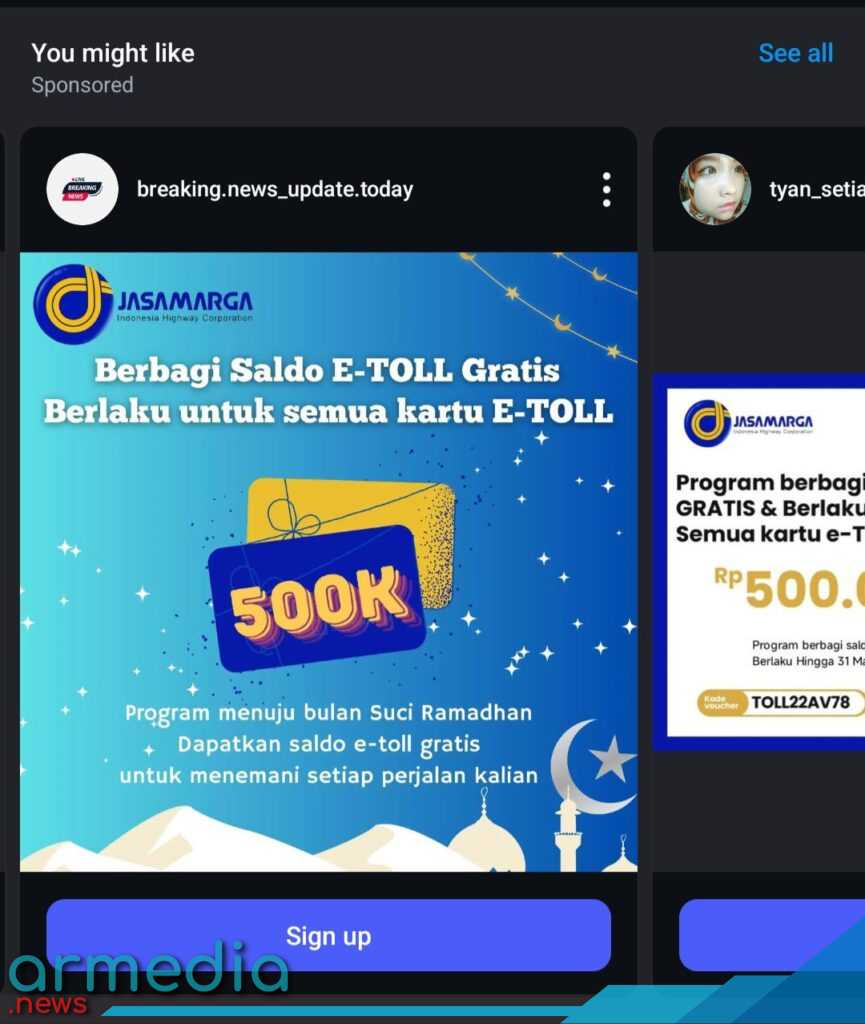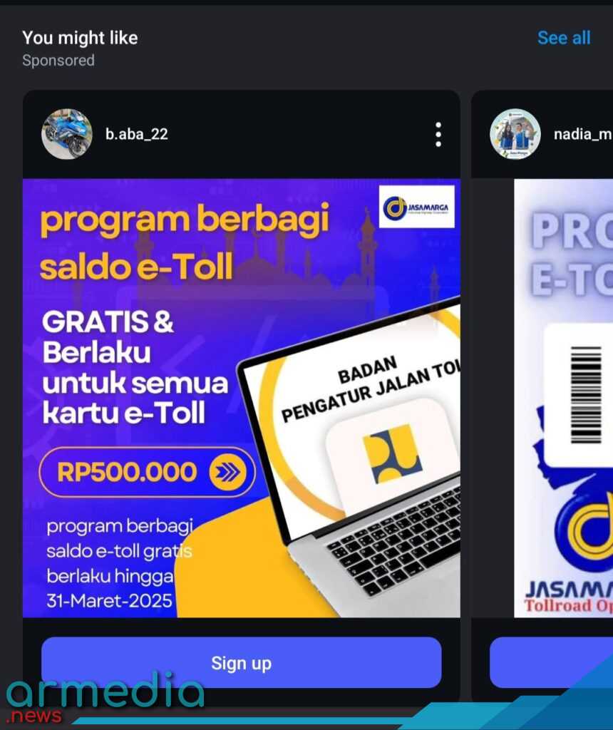 armedia.news | Belakangan ini, media sosial kembali diramaikan dengan berbagai modus penipuan, salah satunya melalui Instagram. Iklan yang menawarkan saldo e-toll gratis senilai Rp 500.000 kini semakin marak, dan mengatas namakan PT Jasa Marga dan Pengelola Jalan Tol yang menarik perhatian pengguna dengan janji hadiah yang menggiurkan. Namun, tahukah Anda bahwa klaim tersebut sama sekali tidak benar.