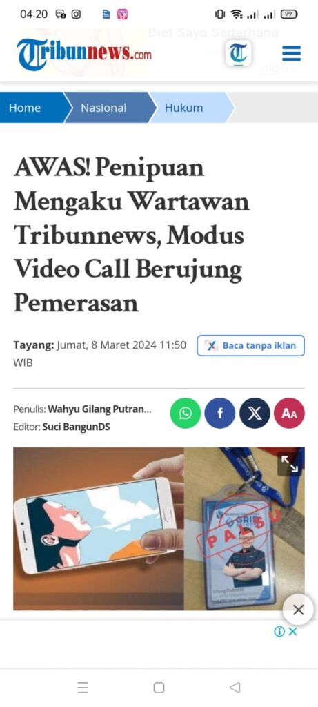 ARMEDIA.news ll Banyuwangi, 20 November 2024 – Kasus penipuan dan pemerasan yang mengatasnamakan media Tribunnews kembali terjadi. Kali ini, pelaku yang diduga bernama Noviar Arya Putra, bersama dengan kontak bernama Tiara, berhasil menipu korban melalui aplikasi WhatsApp. Modus yang digunakan kali ini mengarah pada ancaman penyebaran video asusila yang direkam secara video call (VC).