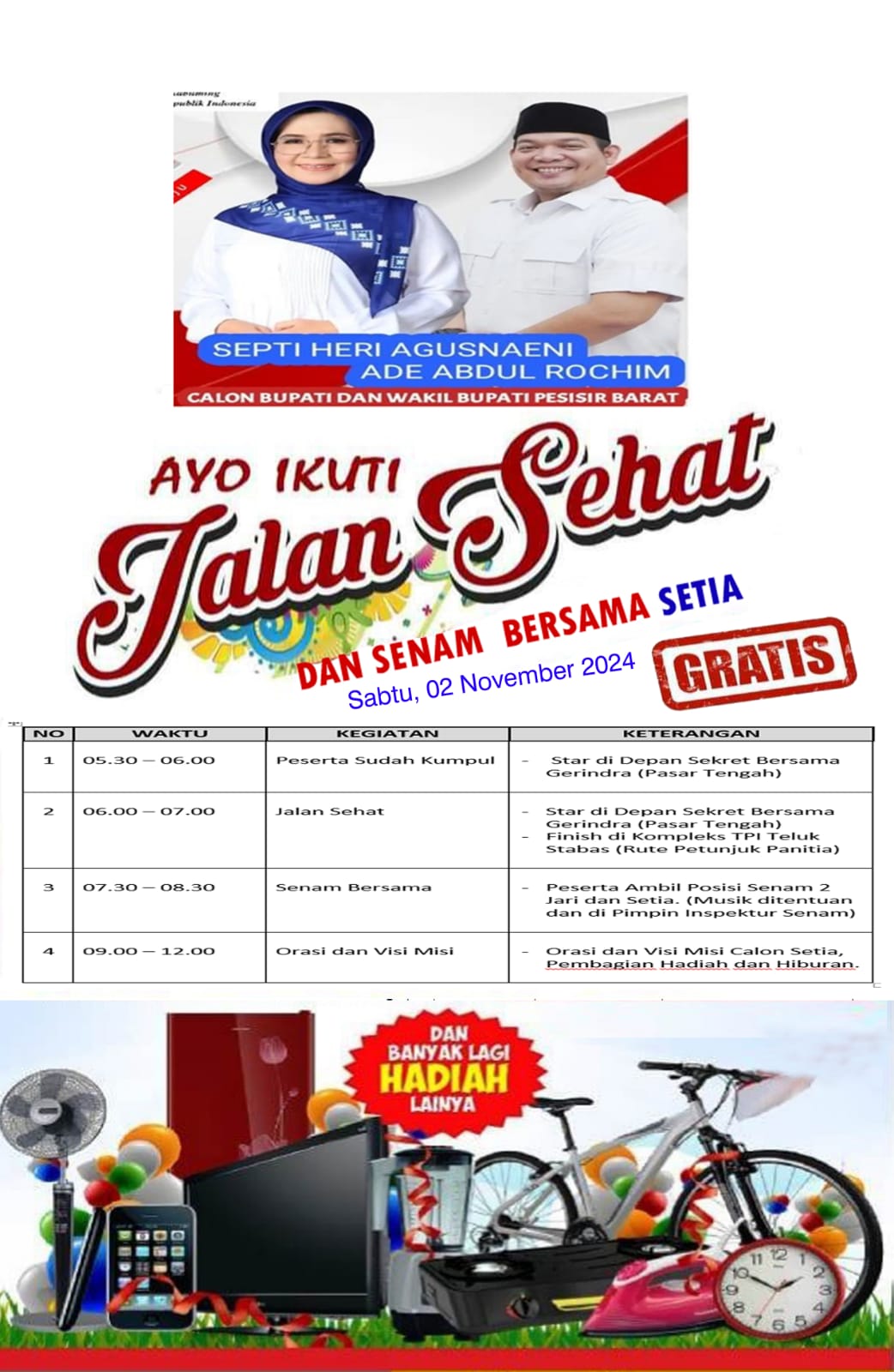 Jalan Sehat dan Senam bersama Setia tersebut yang rencananya akan digelar pada hari Sabtu tanggal 02 November mendatang oleh Paslon Septi Heri Agusnaeni – Ade Abdul Rohim dalam rangka kampanye pilkada serentak dan bertujuan untuk meningkatkan partisipasi pemilih pada Pilkada 2024,