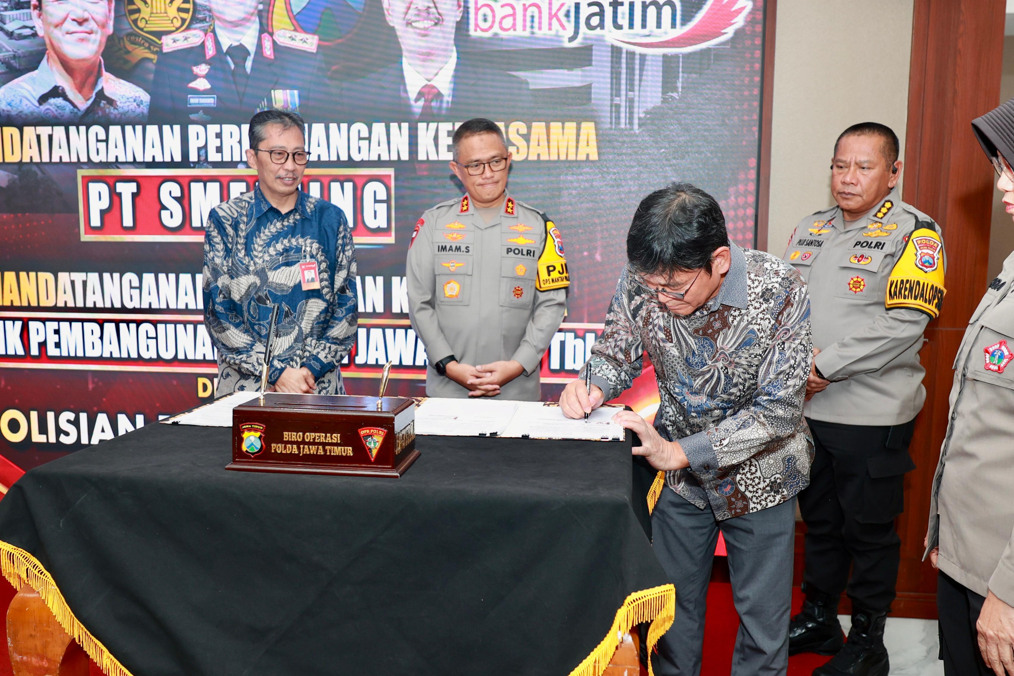 Kapolda Jawa Timur Irjen Pol. Imam Sugianto bersama Pejabat Utama (PJU) Polda Jatim, dan Direktur PT. Smelting, Mr. Ryuichi Hasegawa, serta Direktur Utama Bank Jatim, Busrul Iman, mengikuti kegiatan ini dan melakukan penandatanganan perjanjian kerjasama ini.