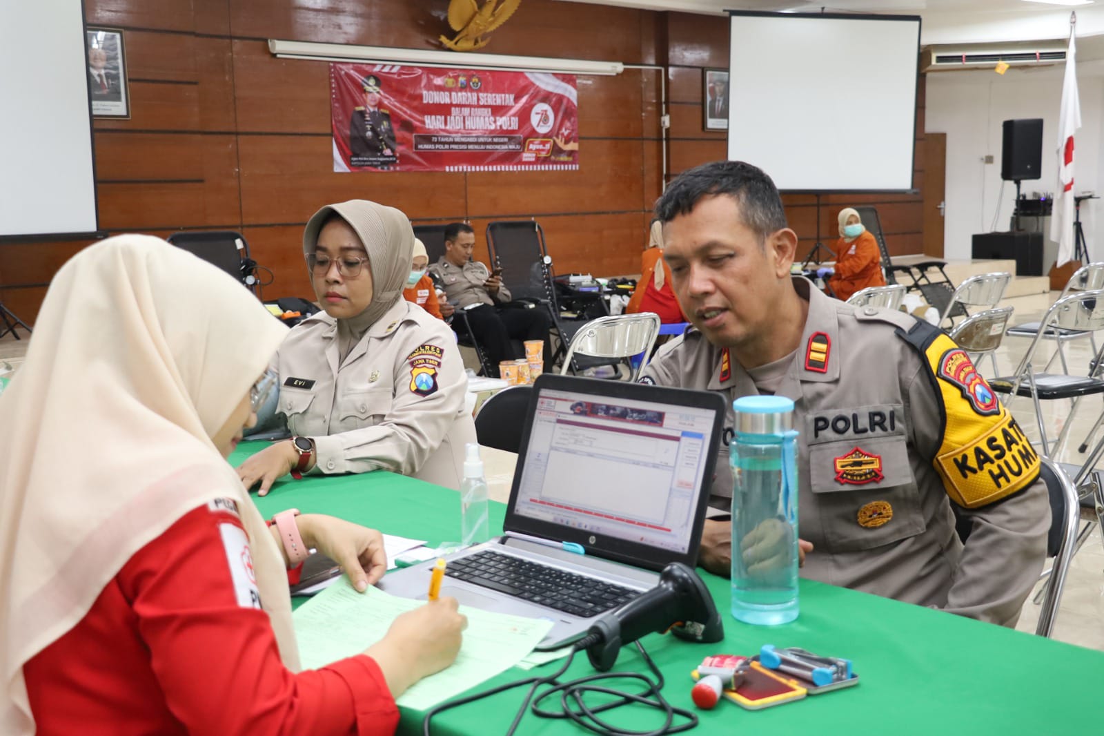 Sebanyak 27 kantong darah berhasil dikumpulkan dari para personel yang antusias mengikuti kegiatan bakti sosial donor darah bertajuk ’73 Tahun Mengabdi untuk Negeri, Humas Polri Presisi Menuju Indonesia Maju’.